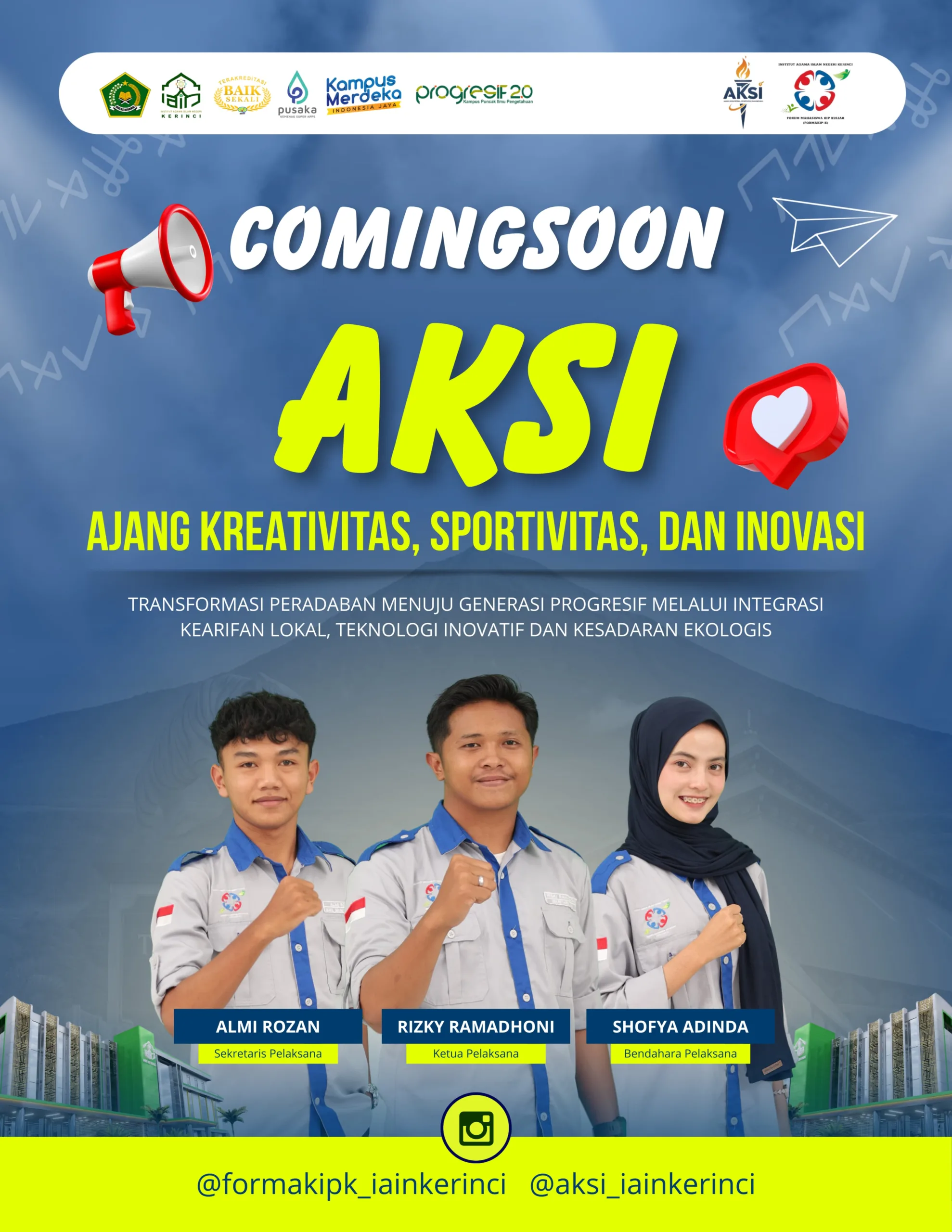 Kerinci – FORMA KIP-K IAIN Kerinci akan menyelenggarakan event nasional yaitu Ajang Kreativitas Sportivitas dan Innovasi ( AKSI) yang bertemakan, Transformasi peradaban menuju generasi progresif melalui integrasi kearifan lokal, teknologi inovatif, dan kesadaran ekologis. Event nasional AKSI akan di laksanakan pada tanggal 17 hingga 19 November yang akan mendatangkan .