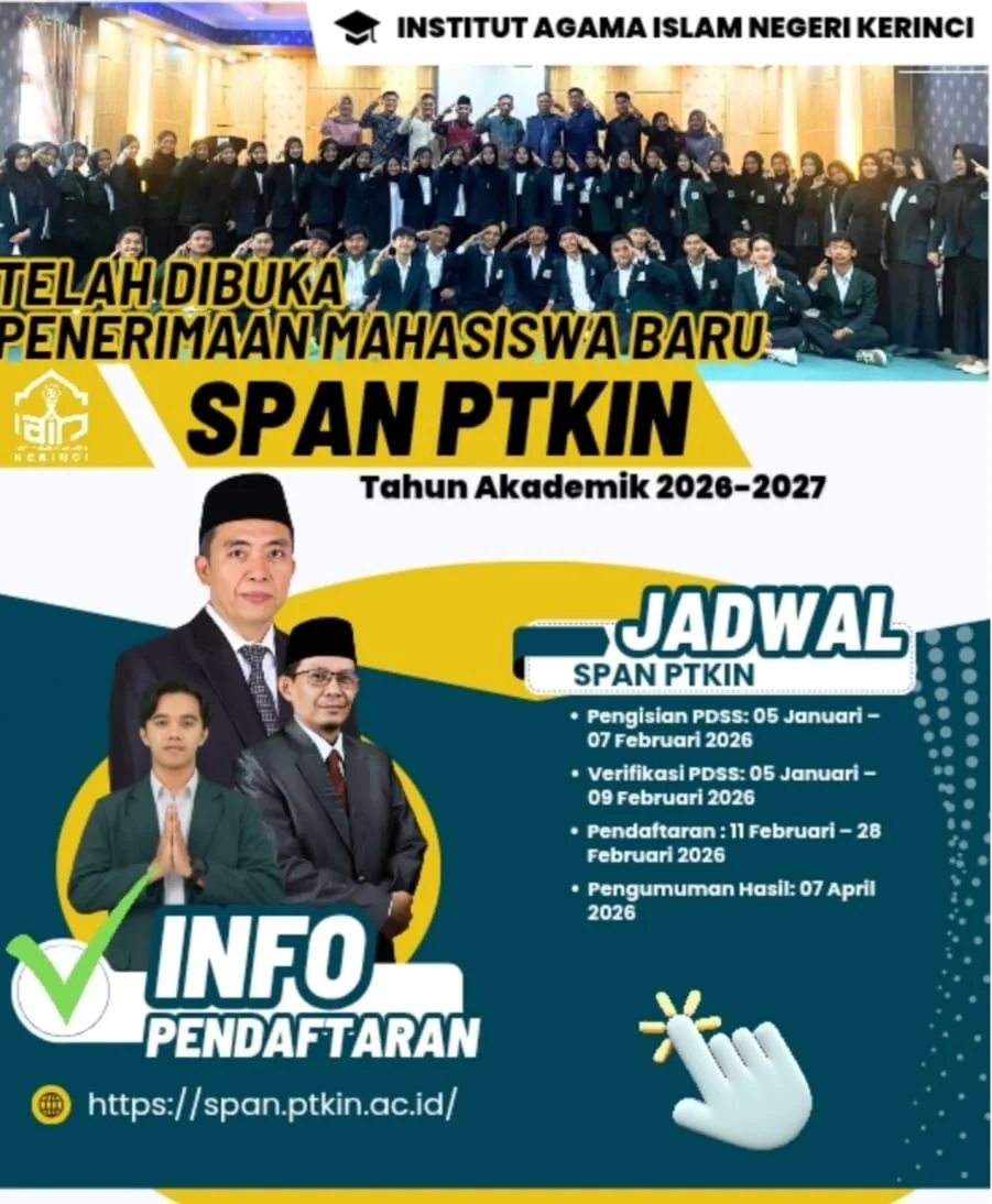 Lebih lanjut Dzikril Ikhsan menambahkan, Bagi calon mahasiswa yang ingin mendaftar, proses pendaftaran dilakukan secara daring melalui laman resmi https://span.ptkin.ac.id/. Untuk informasi lebih lanjut mengenai program studi dan profil kampus, dapat mengunjungi website resmi IAIN Kerinci di www.iainkerinci.ac.id.
