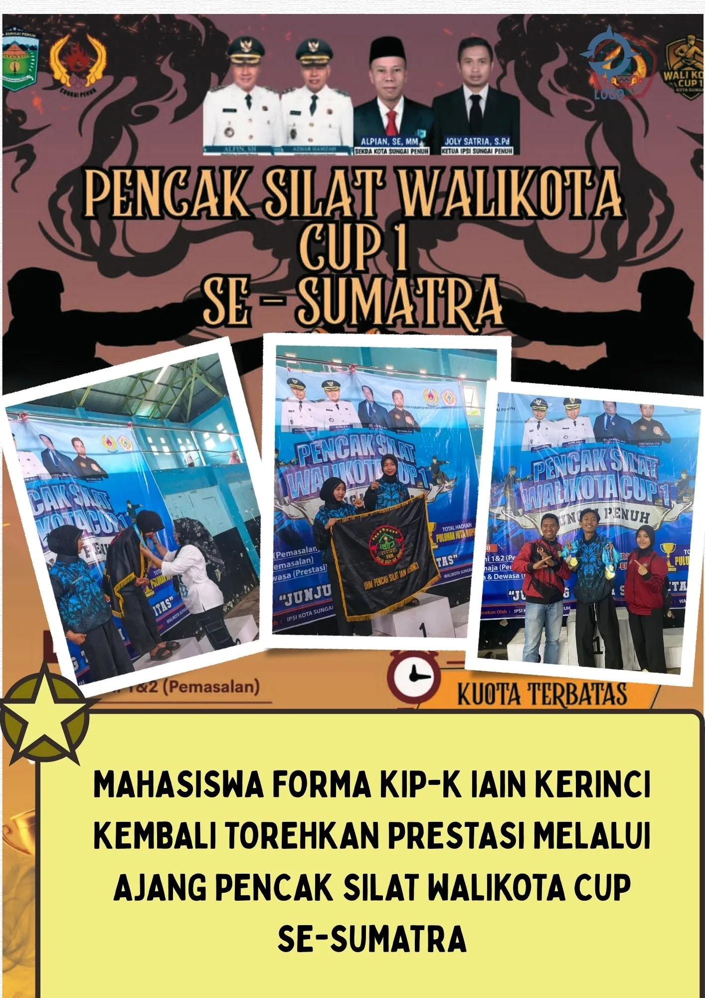 Kerinci – FORMA KIP-K IAIN Kerinci kembali membuktikan bahwa prestasi akademik dan non-akademik dapat berjalan beriringan. Kali ini, FORMA KIP-K sukses menorehkan prestasi gemilang pada ajang Kejuaraan Pencak Silat Walikota Cup I Se-Sumatra tahun 2025.