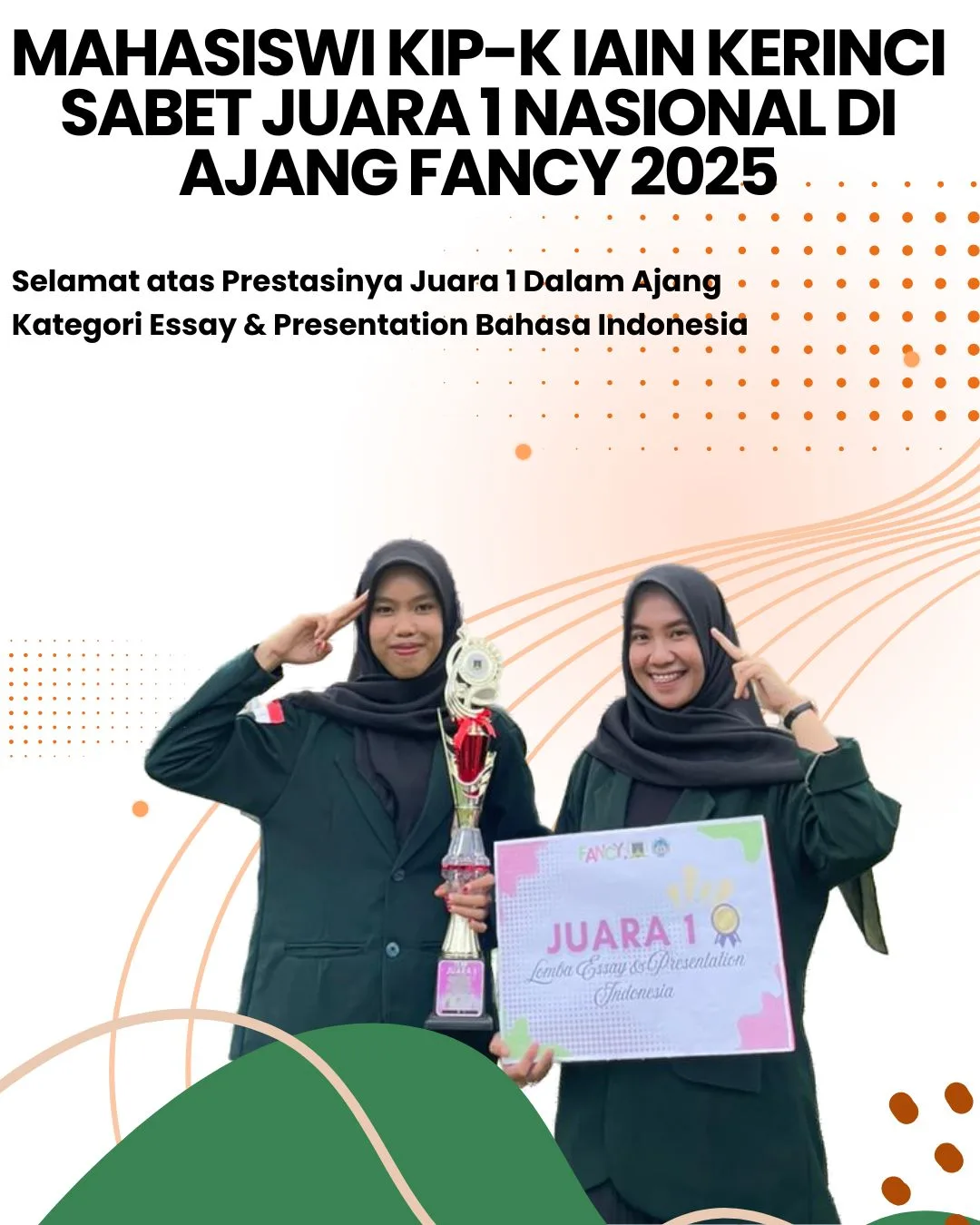 Kerinci – Dua mahasiswi penerima Kartu Indonesia Pintar Kuliah (KIP-K) dari Fakultas Syariah IAIN Kerinci kembali mengharumkan nama kampus di tingkat nasional. Mereka adalah Saskia Mawaddah dari Prodi Hukum Pidana Islam dan Durratul Humaira dari Prodi Hukum Keluarga Islam. Keduanya meraih Juara 1 Kategori Essay & Presentation Bahasa Indonesia pada ajang Foreign Language Competition (FANCY) 2025 yang diselenggarakan oleh UKBA Universitas Negeri Padang.