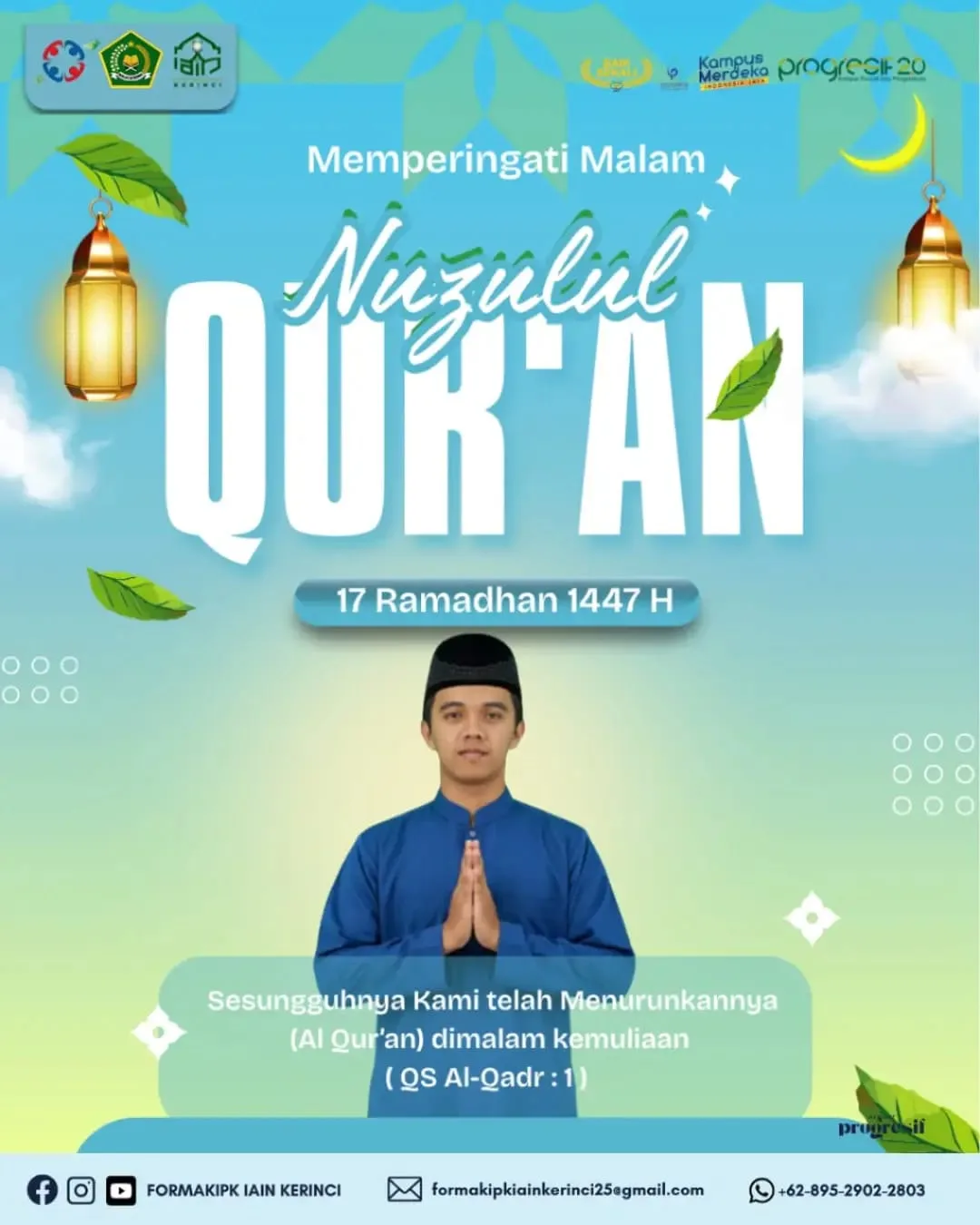Dalam peringatan Nuzulul Qur’an tahun ini, FORMA KIP-K IAIN Kerinci merujuk pada Surah Al-Qadr ayat 1: “Sesungguhnya Kami telah menurunkannya (Al-Qur’an) pada malam kemuliaan.” Ayat ini menjadi pengingat bagi seluruh manusia terkhususnya bagi Mahasiswa IAIN Kerinci akan agungnya mukjizat yang diturunkan kepada Nabi Muhammad SAW tersebut.