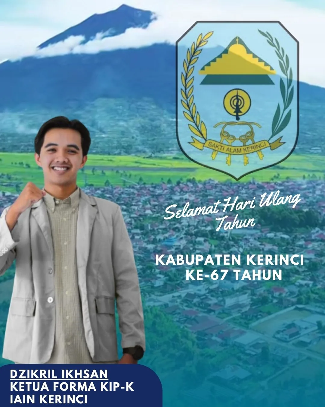“Atas nama seluruh pengurus dan anggota FORMA KIP-K IAIN Kerinci, kami mengucapkan Selamat Hari Ulang Tahun ke-67 untuk Kabupaten Kerinci,” ujar Dzikril.