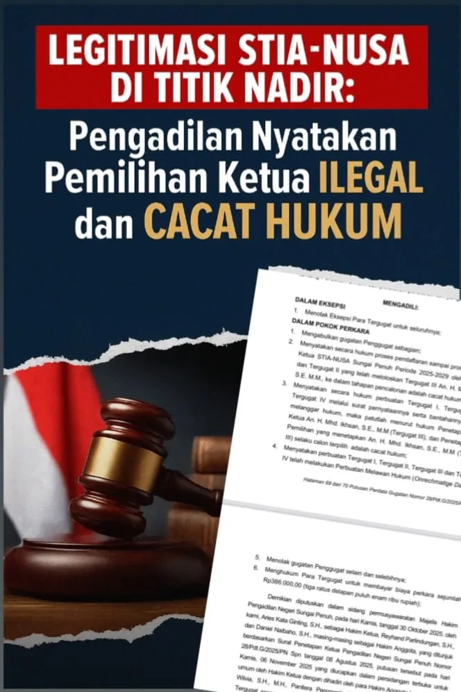 Sungai Penuh-Pengadilan Negeri Sungai Penuh melalui putusan Nomor 28/Pdt.G/2025/PN Spn menyatakan proses pemilihan Ketua STIA Nusantara Sakti (STIA-NUSA) Sungai Penuh periode 2025–2029 cacat hukum dan melawan hukum (onrechtmatige daad).